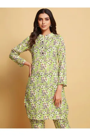 Embrace effortless style with this stunning Green Floral Printed Kurta Set. Crafted from pure cotton, the straight kurta features an elegant Mandarin collar and a vibrant floral print, perfect for adding a touch of freshness to your wardrobe. This comfortable yet chic set includes matching trousers for a complete, polished look. Ideal for casual outings, daily wear, or festive occasions. The breathable pure cotton fabric ensures all-day comfort. Shop this beautiful green floral kurta set today for a blend of traditional design and modern comfort. Available in multiple sizes. Pure cotton kurta set, floral print, Mandarin collar, comfortable trousers.